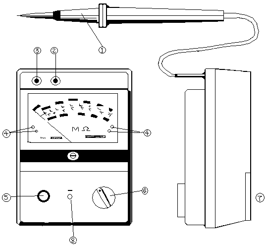 通常儀表的功能開關(guān)⑥置于OFF位,在進(jìn)行測量時將它置于MΩ或GΩ位,從儀表的地端③和②分別引出兩根測試線到被測物的地端和大地,再將儀表的探頭①接被測物測試點并按測試紐⑤(順時針方向旋轉(zhuǎn)后可自鎖)既可開始測量.