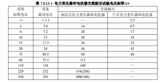 2.容量為 8000kVA 及以上、繞組額定電壓在 110kV 以下的變壓器,在有試驗設備時,可按表 7.0.13-1 試驗電壓標準,進行線端交流耐壓試驗;