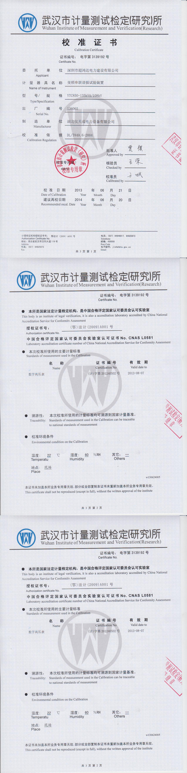 YTC850系列變頻串聯(lián)諧振試驗(yàn)裝置資質(zhì)證書